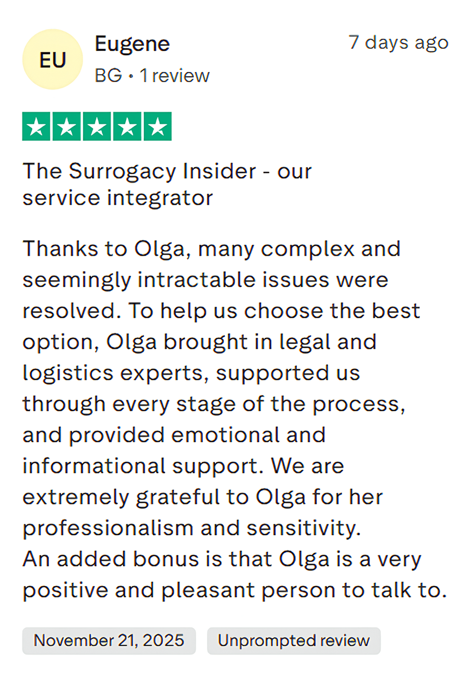 "Hi, I’m Olga, founder of The Surrogacy Insider. Since 2019, I’ve helped shape over 250 families through international surrogacy, working across 7 countries.